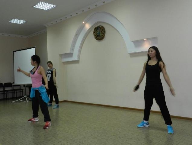 Осыдан кейін «Зумба» фитнес залының басшысы И. Шинның басқаруымен оқушылар әуен арқылы таңғы жаттығу жасады.