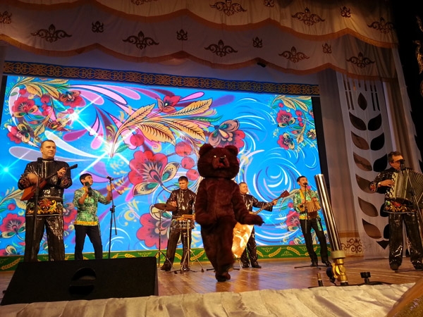 ВИА "Забытые мелодии" из Карабалыкского района мало того, что вышли на сцену практически с целым оркестром - балалайкой, аккордеоном, ударной установкой, балалайкой-контрабасом, бубенцами - так еще и для пущего эффекта пригласили на сцену... медведя! Зрители от удивления и смеялись, и свистели, и хлопали. Зал заплясал вместе с косолапым артистом.