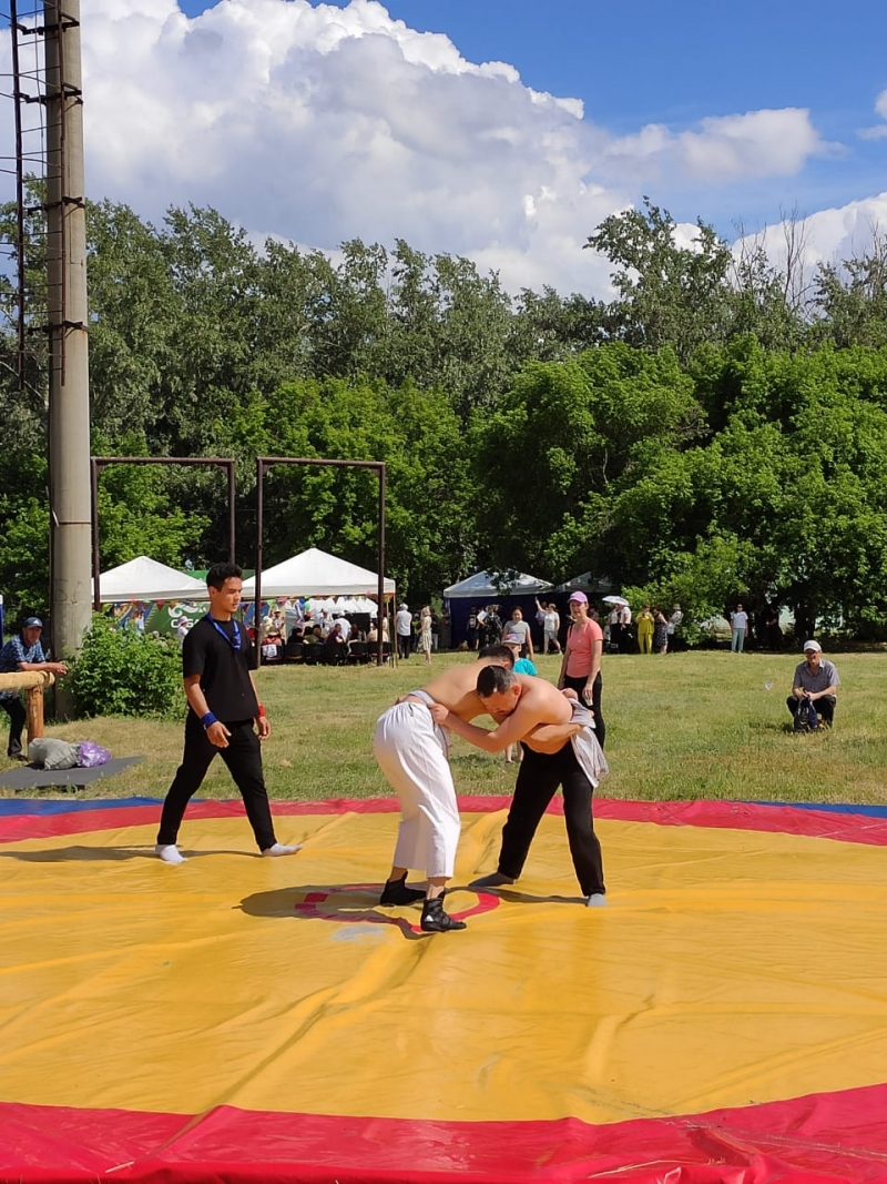 Рядом шли народные игры, которые так любят дети: ходьба с коромыслом, битьё горшков и бег с ложкой с яйцом. Также проходили и спортивные состязания - армрестлинг для взрослых и детей, битва мешками на бревне и, конечно, борьба на поясах куряш. В последнем виде спорта победителем стал житель Костаная по имени Жанбыршы. Именно он и забрал победный трофей - живого барана.
