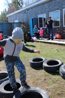 Особенно детей развеселила военно-спортивная эстафета. Они поделились на команды и состязались в преодолении разных препятствий. Например, прыгали по баллонам, бросали шарики в корзину. На площадке стоял шум, крик, дети болели друг за друга.