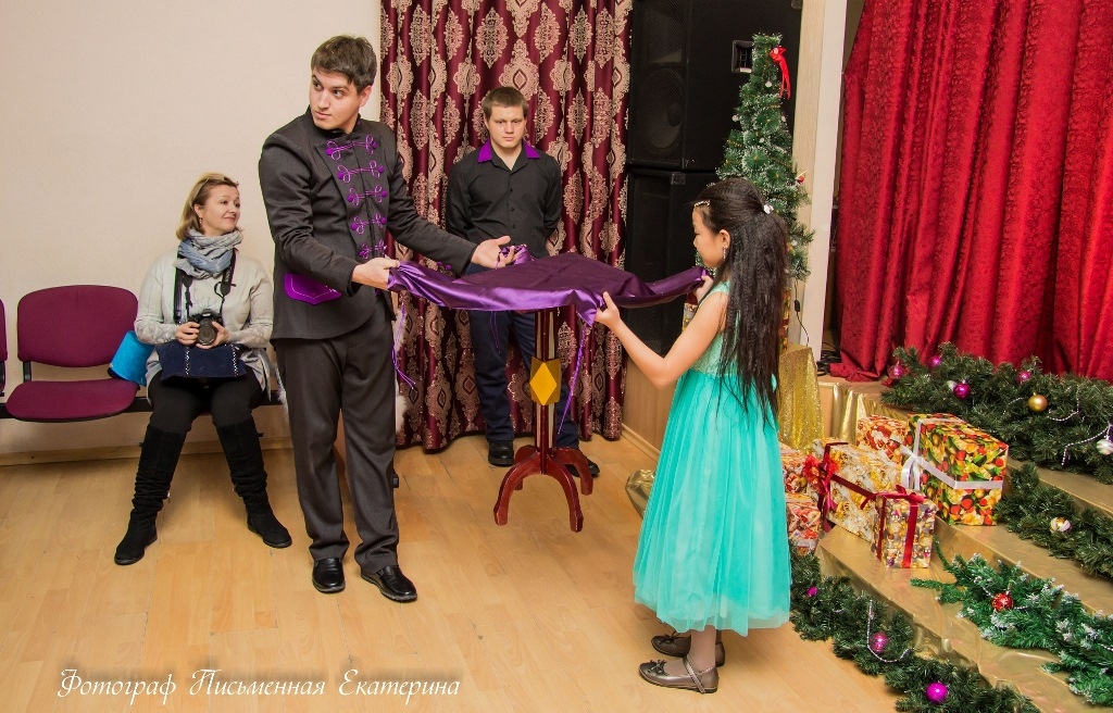 А когда у нее отсырела метла и Ягуся отправилась ее сушить, детей порадовал своими фокусами Антон Вознесенский. Что он только не вытворял, в его руках исчезали предметы, из рукавов появлялись ленты, а из коробки вдруг выскочил кролик. Дети были в восторге, кричали, хлопали, радовались.